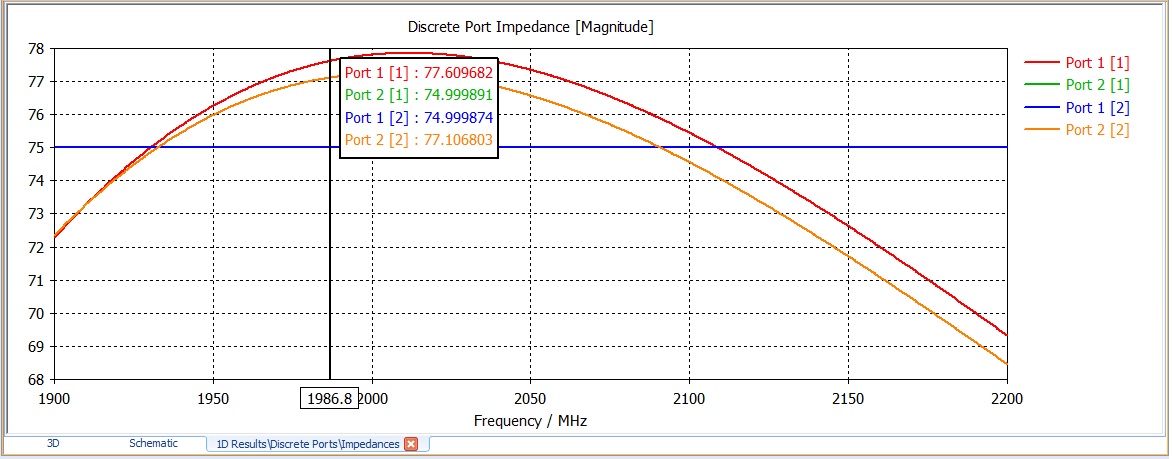 Сделал модель, нагрузил по концам сопротивлением 50Ом, на торце разъема назначил волновой порт, получил график импеданса. Иммитацию кабеля подогнал под 75Ом, длиной 3/4 лямбда, разъем - иммитация F-разъема отпиленного от делителя (60Ом). В моем понимании все работает, но может я ошибаюсь?
