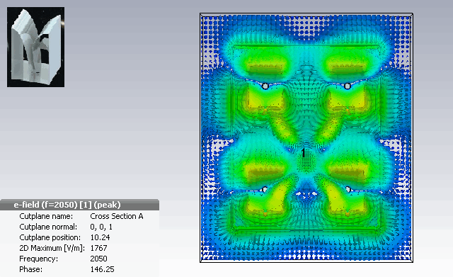 Интересное распределение токов у этой антенны, верхние патчи "крутятся" влево, а нижние вправо. Вот теперь думаю, хорошо это или плохо? Может в этом и секрет ее эффективности?