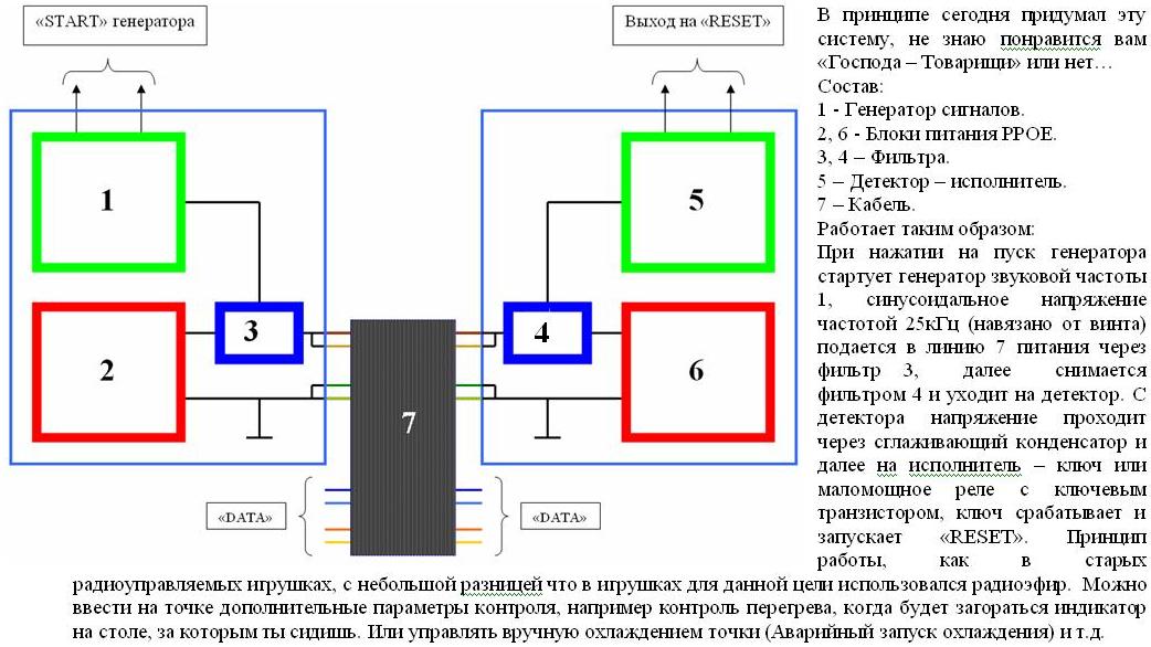 Была идея прифигарить за 80грн "тревожную кнопку"(штука такая работает на 433,радиус действия 20-50м,нажал на пультике-релюшка разомкнулася)-типа подошел к точке,пультком кнопнул-девайс ребутнуло)))