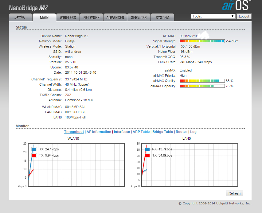 ребят, прошу помощи, у меня стоят NanoBridge M2, одна на 5 этаже другая на трубе 11м в частном секторе, расстояния 600м, видимость прямая. на базе 100мбит скорость, но ко мне доходит 60мбит а от меня 95мбит, пере ковырял все настройки/