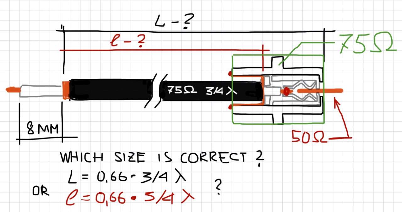 Длину считать по центральной жиле трансформатора, при условии очень коротких концов. Но в твоём варианте наверное логичней считать от оплётки до места припайки ЦЖ к ламелькам в Фке. Опять же, если в Фку будет впендюриваться РГ-58, то на ламельках останется в районе75 ом., а если РГ-8Х (5Д), то тогда около 40-45 ом. Если немного заточить ЦЖ в 5Д, то на ламельках будет точняк 50 ом.(речь о качественной Фке).