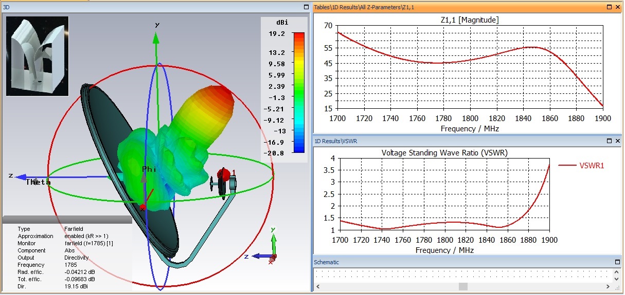 В тарелке этот облучатель неважно выглядит. Пробовал двигать по-всякому, суть картины не меняется. Если ставишь порт на 45 градусов, сопротивление падает.