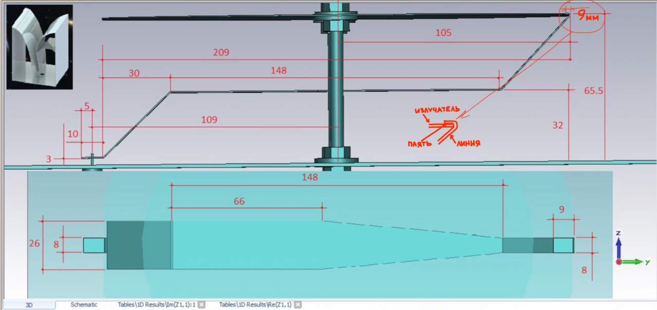 Всем здравствуйте! Хочу сделать антенну цифра9 по размерам из поста 308. Но не могу понять к чему там дан размер 9мм на линии. И не очень понятно конструктивно как сделано крепление линии к вибратору. И ещё вопрос.. нужен-ли на вибраторе зазор для крепления линии ? Или на сколько мм. линия "наползает" на вибратор. Разжуйте пожалуйста...