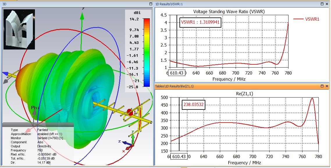 Еше одна Яга, по просьбе Vitek_90. Рабочий диапазон 600-760 МГц, усиление 12.1-14.2 дби, импеданс 300 Ом, КСВ <1.4 во всем диапазоне. Траверса - труба 22 мм диаметром, толщина стенки 1 мм, директоры и остальные элементы - медная трубка 10 мм. Крепление к траверсе - пайка, элементы утоплены в траверсу на 1мм. Все директоры одинаковой длины 158 мм.