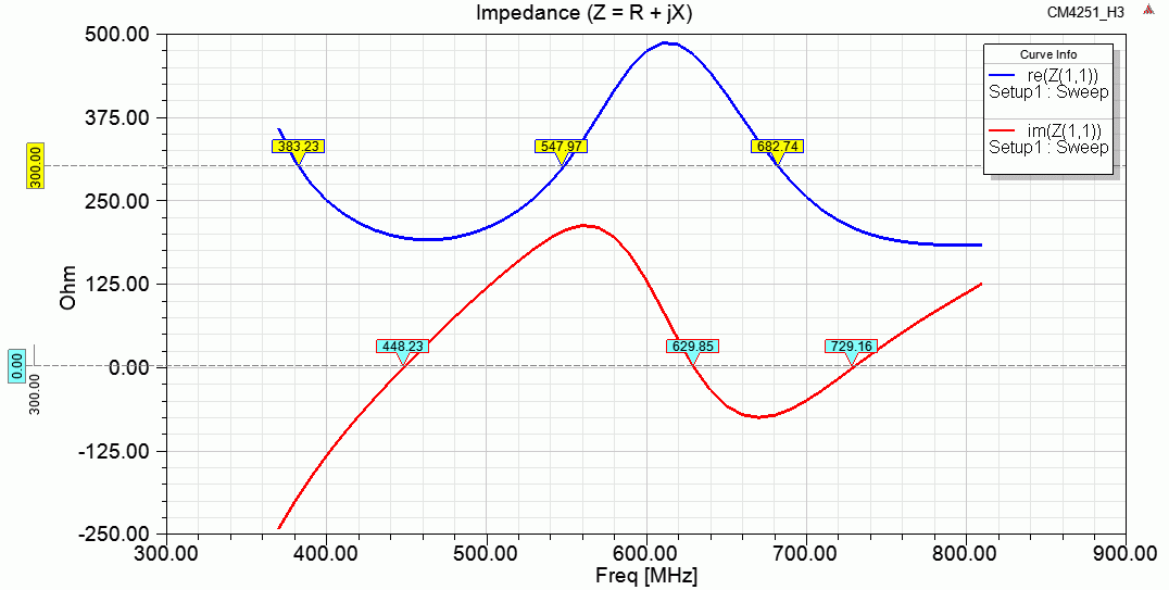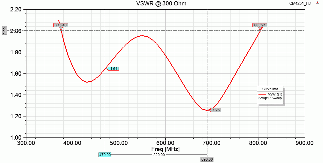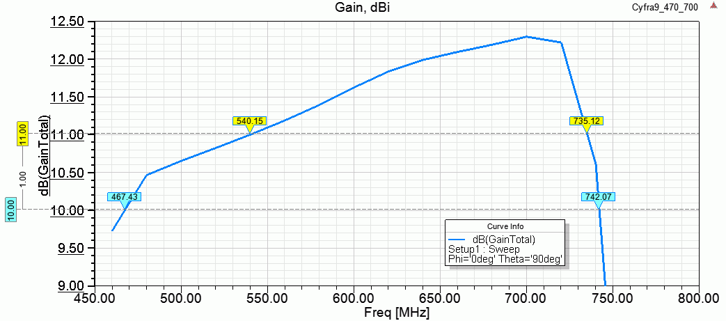 Вот размеры оптимизированные под 470-690 (в этих размерах до 800 МГц ещё дает под 12 dBi чистыми, если интересуют частоты выше 700 можно подвинуть туда-сюда размеры - или пожертвовать низами и пик на 800 МГц дать, или смириться с паденим на 1.5 дБ сверху)