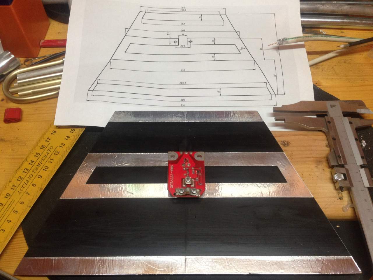 Оказалось, что у меня фольга шириной 50 мм, пришлось пересчитать геометрию. В итоге КСВ остался практически таким же, усиление незначительно подросло на верхних частотах.