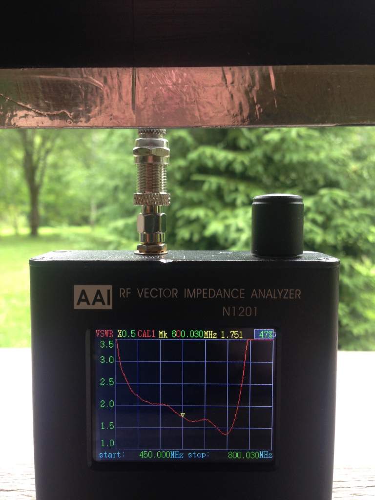 Оказалось, что у меня фольга шириной 50 мм, пришлось пересчитать геометрию. В итоге КСВ остался практически таким же, усиление незначительно подросло на верхних частотах.