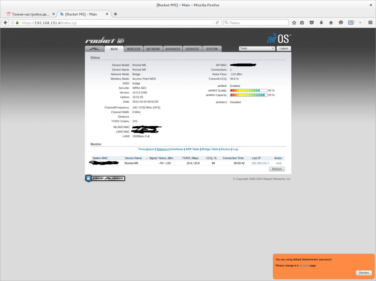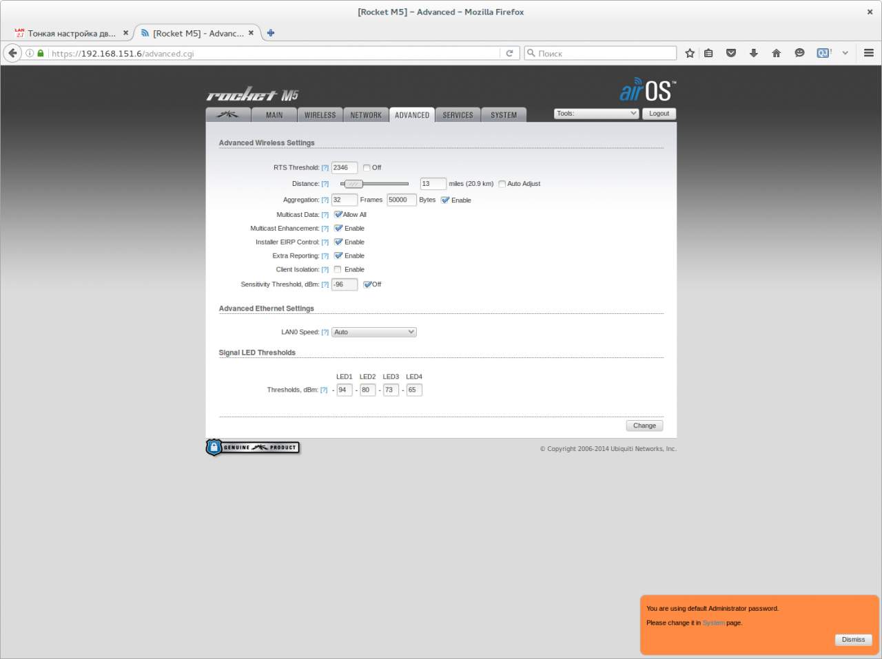 Добрый день, уважаемое сообщество. Прошу Вашей помощи в настройке PtP на 22км на Рокетах М5. Опыта у меня мизер, до этого только ставил мост на PowerBeam AC500 на 10км, особых проблем не было. А тут никак :( Сразу хочу сказать что я не прошу все сделать за меня, я перечитал эту тему страниц на 20 назад, и обращаюсь за помощью только потому что ну не получается)