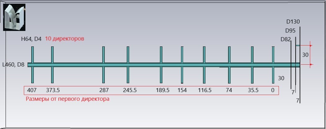 директоры сделаны из проволоки диаметром 4 мм. Все смонтировано на трубке ф8 мм, и шпильке Ф6 мм, диски из оцинковки 0.5 мм, в качестве разъема F-штекер, пин - 2 мм диаметром. Усиление по краям 14;14.6 дБи, в центре 14.5;14.6.