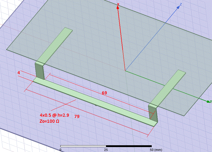 Два шунта соединены полосковой линией передачи 100 Ом: например 4 мм на высоте 2.9 мм от рефлектора (можно другие пропорции, в т.ч. круглый провод, лишь бы 100 Ом)