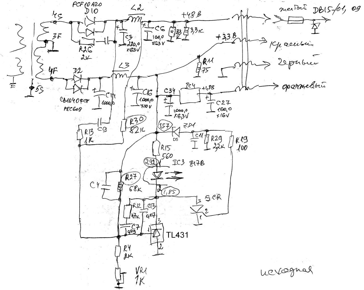 Переделываю схему обратной связи для стабилизации 3,3В с подачей питания на TL431 от высокого. Запускаю – высокое 58В вместо 48…
