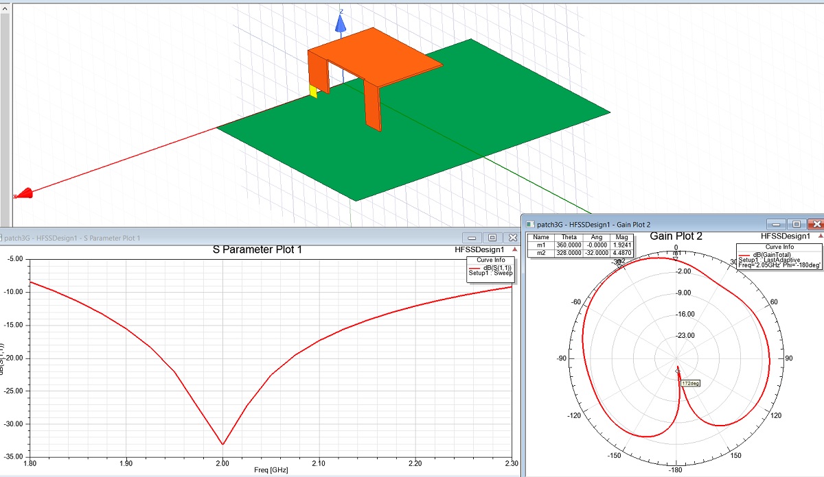 Спасибо всем ответившим по теме!Сообщение от uve Посмотреть сообщениеЯ посмотрел эту модель в HFSS. По полосе частот получается несколько хуже, чем на скрине, но близко. Максимальное усиление около 4.5 дБi( уж больно узкий патч - 20 мм) и "косит" на 30 гр. от нормали.
