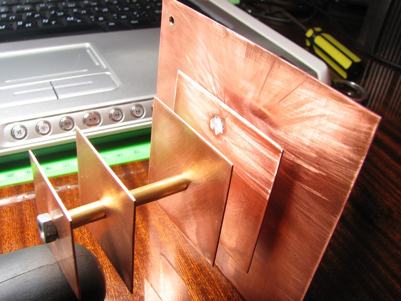 далее центральную жилу кабеля в изоляторе пропустил сквозь отверстие в экране и припаял центральный провод к следующей пластине.