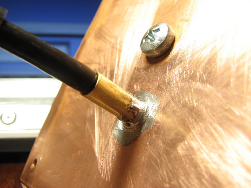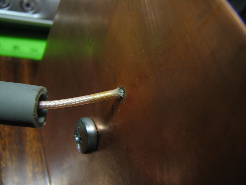 таким образом получилось что оплетка кабеля хоть и припаяна к трубке, а сама трубка к листу рефлектора, но расстояние от места пайки оплетки до рефлектора примерно 3-4 мм.