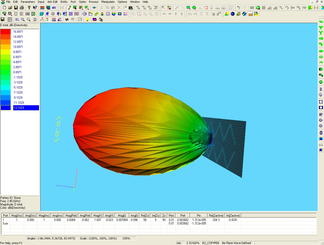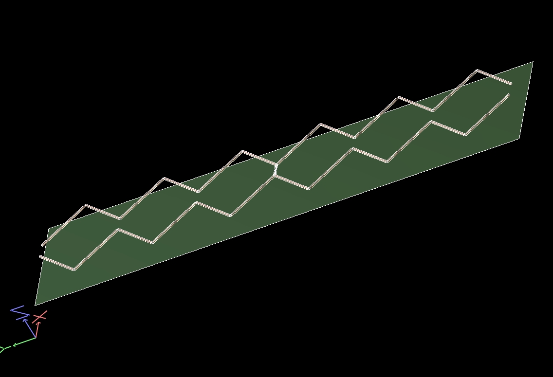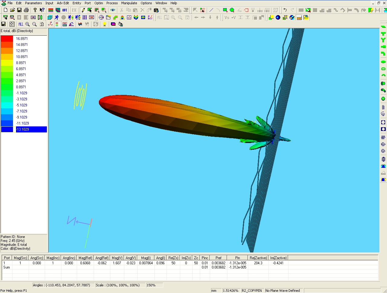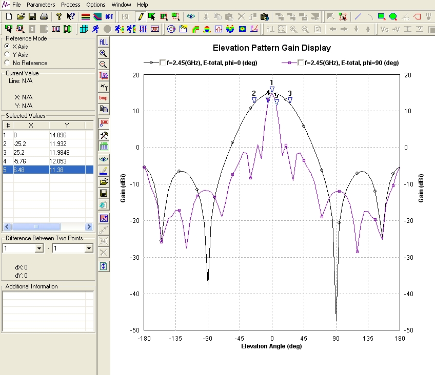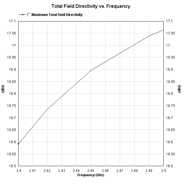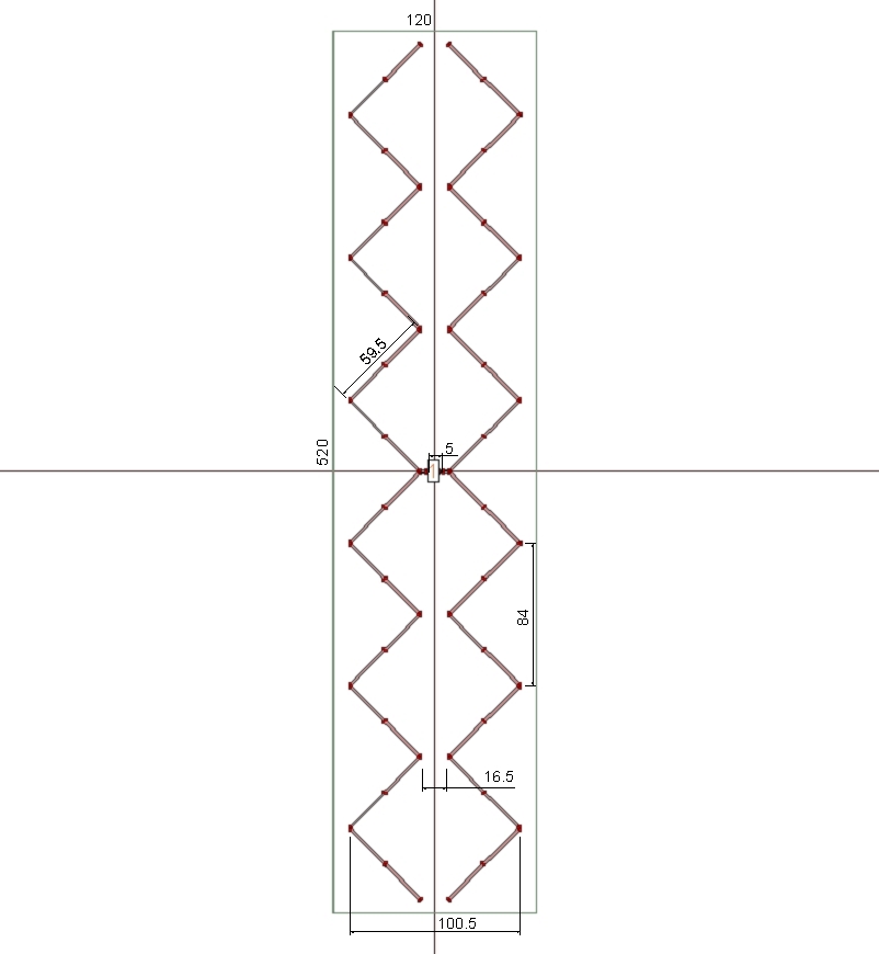 Рефлектор 120х520 мм. Расстояние от рефлектора до центра проводов 17.5 мм. Диаметр провода 2.3 мм (4 кв.мм.). Углы 50 х 12 гр. Усиление около 17 dBi.