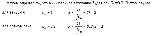Чет я с вами правда отупел...) Где там написано, что определялось оптимальное волновое сопротивление? Там как раз определялось отношение диаметров. А волновое сопротивление,- уже получаем, подставляя в знаменатель корень из диэлектрической проницаемости диэлектрика. Да, для воздуха получаем 75 Ом. Много вы видели кабелей, где в качестве диэлектрика используется воздух? Я ни одного.