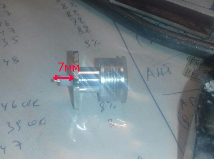 расстояние между рефлектором и местом запитки задано 7мм. А вот пиписка коннектора имеет длину 7мм, что при проходе через толщину рефлектора-1мм укорачивается до 6мм. Для нормальной пайки с точкой запитки полосковой линии не хватает 2мм. Вот в чем катавасия.