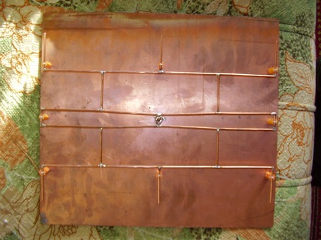 Привет всем!Сделал такую антенну.Результаты восхитительные.Линк на 1км. через деревья дал скорость до 6Мbps (от провайдера 11Mbps).Все сделал из меди: вибраторы- 2,5мм провод,согласователь-медная трубка с внутренним диаметром 6мм и длинной 30мм,пластина из гетинакса 330Х330мм.Может вышло и дороговато,но конечный результат оправдывает затраты.Следующую антенну сделаю из жести,провода 2,5мм и латунной трубки от FM антенны.Потом сравню результаты.