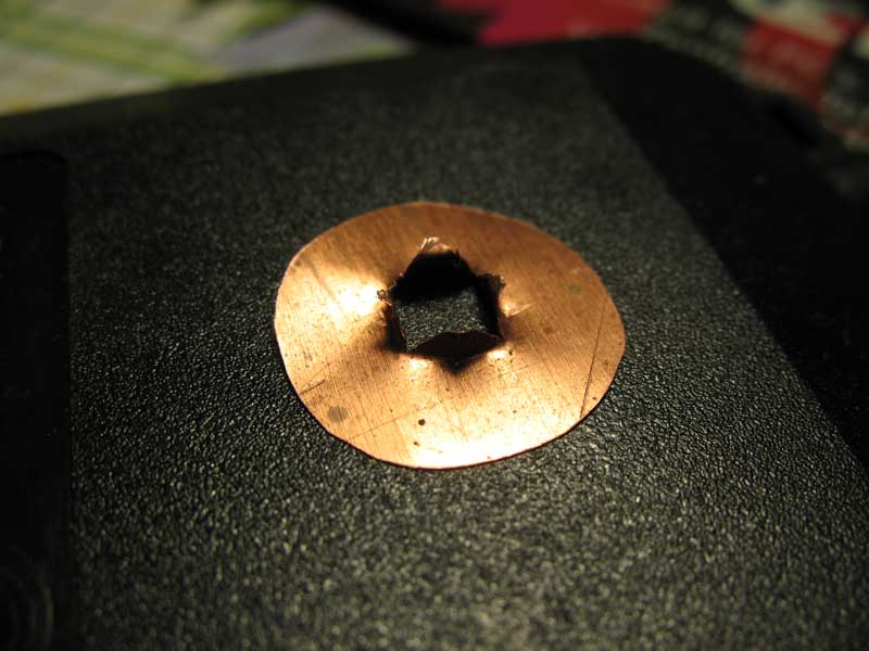 2 Ножницами вырезаю шайбу с отверсием(задиры металла оставляю). См. фото.