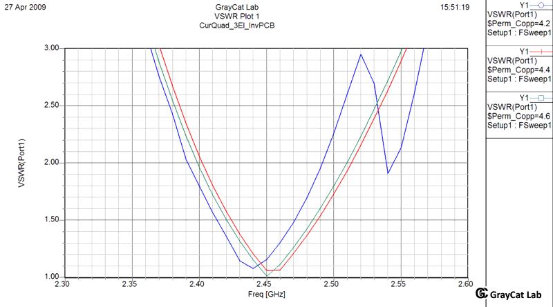 - "CurtainQuad" является в большей степени "магнитной" антенной, в отличие от традиционно входящих в состав панелей патчей, являющихся "электрическими" элементами. На характеристики патчей большое влияние оказывает диэлектрическая проницаемость окружающих материалов, которая очень разнообразна и часто непредсказуема. На "магнитные" же антенны влияние оказывает в основном магнитная проницаемость материалов, которая для большинства диэлектриков близка к 1. Так что, по идее, параметры CurtainQuad будут меньше зависеть от характеристик конструкционных материалов.