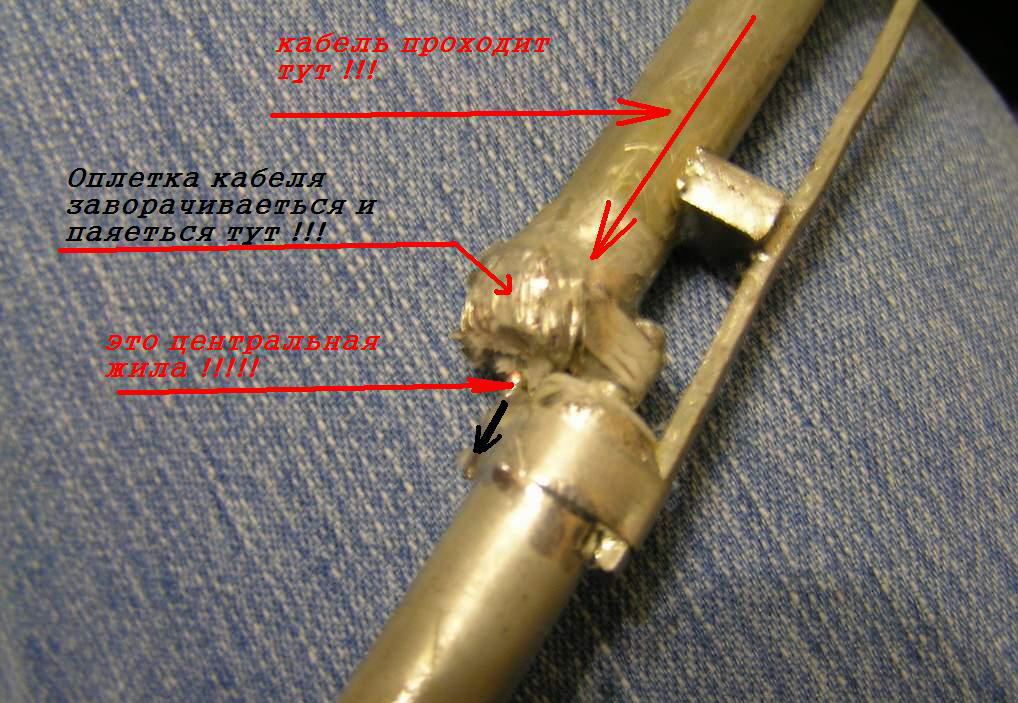 Коаксиал нарубан на полуволновые куски (с учётом Коэф.Укороч.), которые подключены последовательно-перекрёстно (т.е. центральная жила первого куска запаяна на оплётку второго, а оплётка первого на центральную жилу второго. И т.д. жила на оплётку, оплётка на жилу. Без коз. Такая себе змейка). С последнего элемента торчит оголённый 1/4 лямбда.