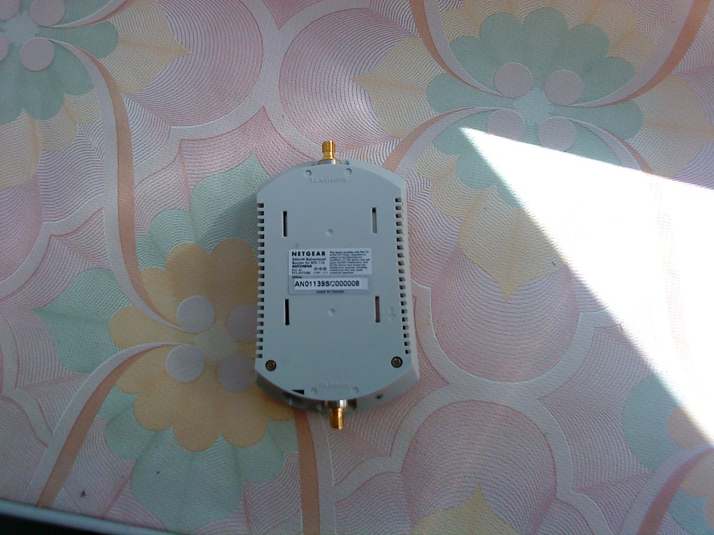 NETGEAR ANT24BNA 500mW Booster for 802.11b снимал телефоном нормального фотика пока нет,на плате стоят две микрухи по входу малая RF5117 http://approsoftware.com/download/rtl8181/doc/5117.pdf по выходу большая RF2163 http://www.rfmd.com/pdfs/2163DS.pdf Провёл сегодня испытание усилка,дальность увеличилась в три раза по сравнению с голым TP-Link 501 у которого на выходе 50мВт.