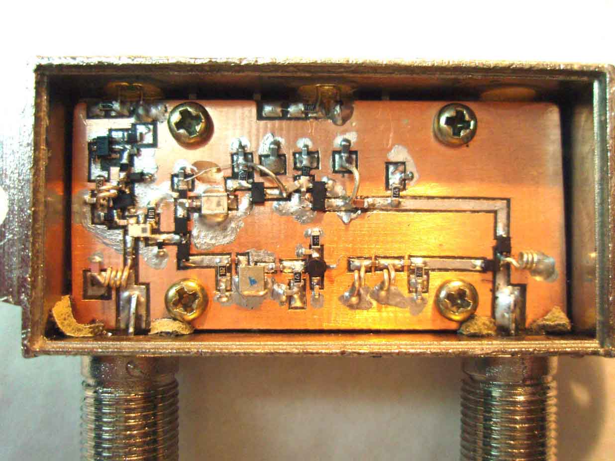 Печатку не выкладываю, нарисуете сами под свой корпус. Без навыков СВЧ монтажа повтарять не советую, лучше немного подождите, я подготовлю матерьял по поднятию мощности 2100АР до 500мВТ без перешивания, без замены штатного усилка!!!:yes: Все очень просто и под силу даже начинающим, надо только ровные руки, микроскоп, или мощную настольную лупу.
