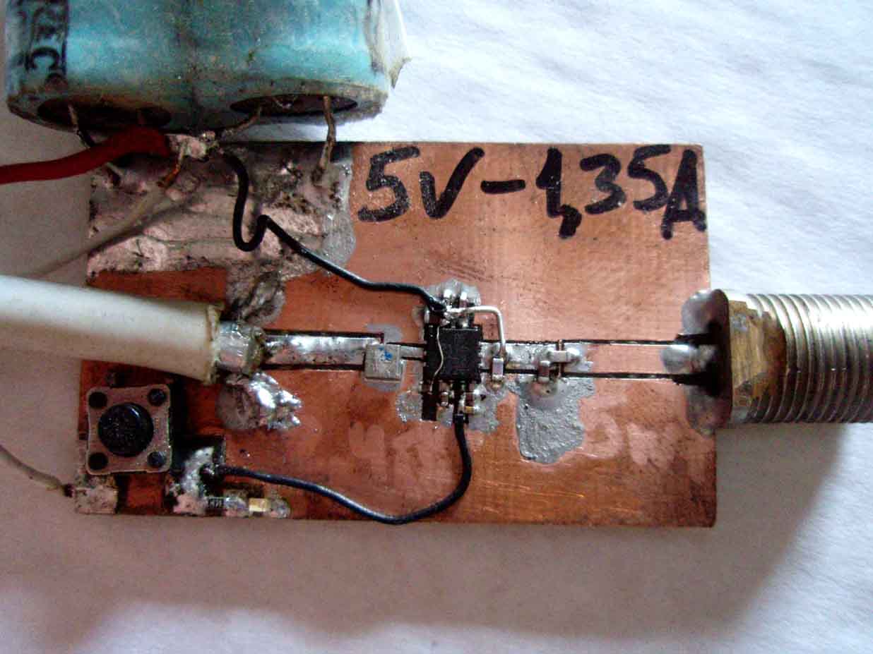 Нет, это не шутка! На фотке макетка усилка на RF2174 , который применяется в старых сотках на 1800МГц и прекрасно тянет такие перегрузы. Готовый усилок на этом модуле стоит в работе, поэтому осталась ток макетка. В принципе схема усилка таже, ток вместо выходного транзюка стоит этот модуль. Скоро почти год как усилок в работе - пока живой! Для нормального охлаждения полигон модуля соединен медным "переходом" с фольгой обратной стороны платы, которая и является теплоотводом.