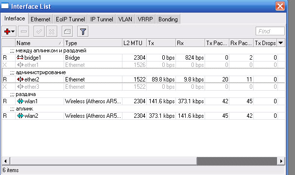 Наконец заработала моя wi-fi сеть! Организована следующим не хитрым способом: dsl интернет, аплинк (bullet) на 9км и потом раздача в радиусе 2км. Все находятся в одном адресном пространстве. На БС стоит РБ433 + 2шт. Р52 с организованным прозрачным бриджем смотрящем на dsl модем. Клиенты (8шт. G700AP перешитые в концептроник) конектятся к dsl модему с запущенным DHCP который и раздаёт адреса. Связь нормальная, пинги и скорость тоже.