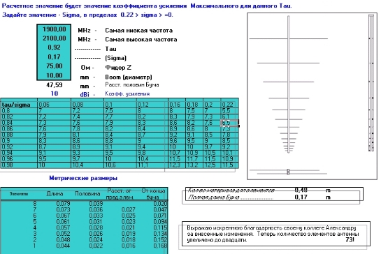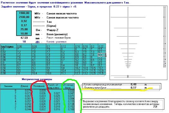 но немогу разобратса с её розмерами, когда перещитываю на 1900-2100 МГ. и даже если ввожу ту частоту что на ссылке то прогама перещота выдаёт савсем другиэ цифри чем в примере.