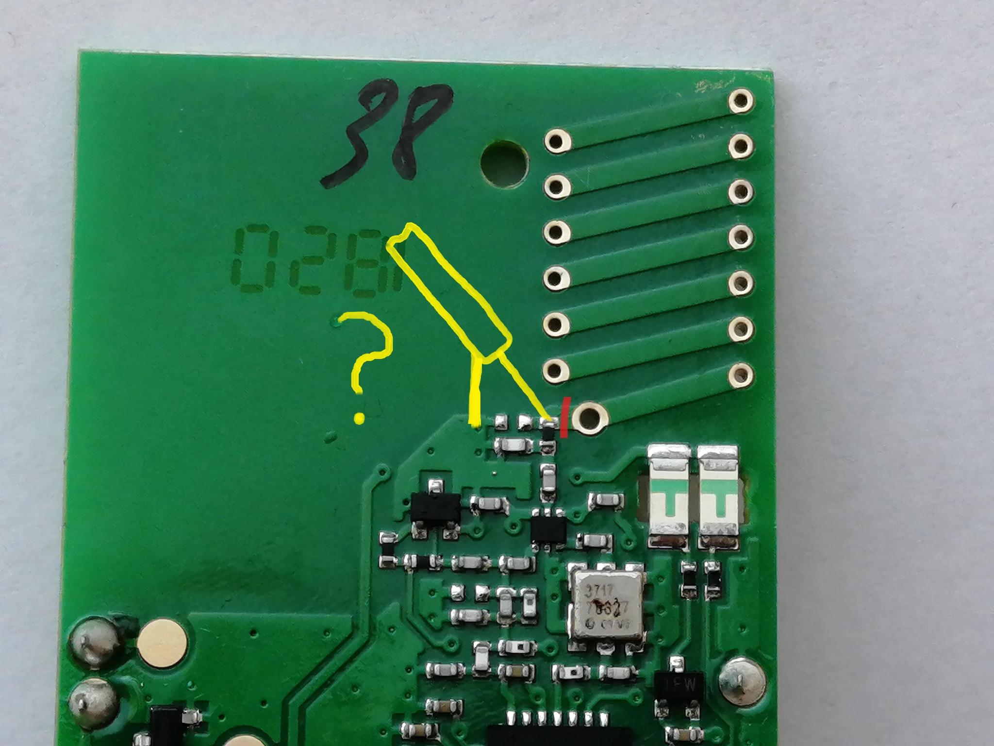 Есть охранный датчик-геркон на 868 МГц. Хотелось бы увеличить дальность связи на открытом пространстве. Подскажите, пожалуйста, куда припаять кабель от внешней антенны? Я верно на рисунке указал?