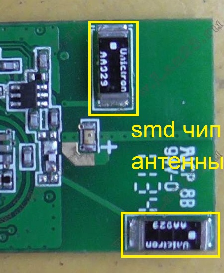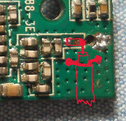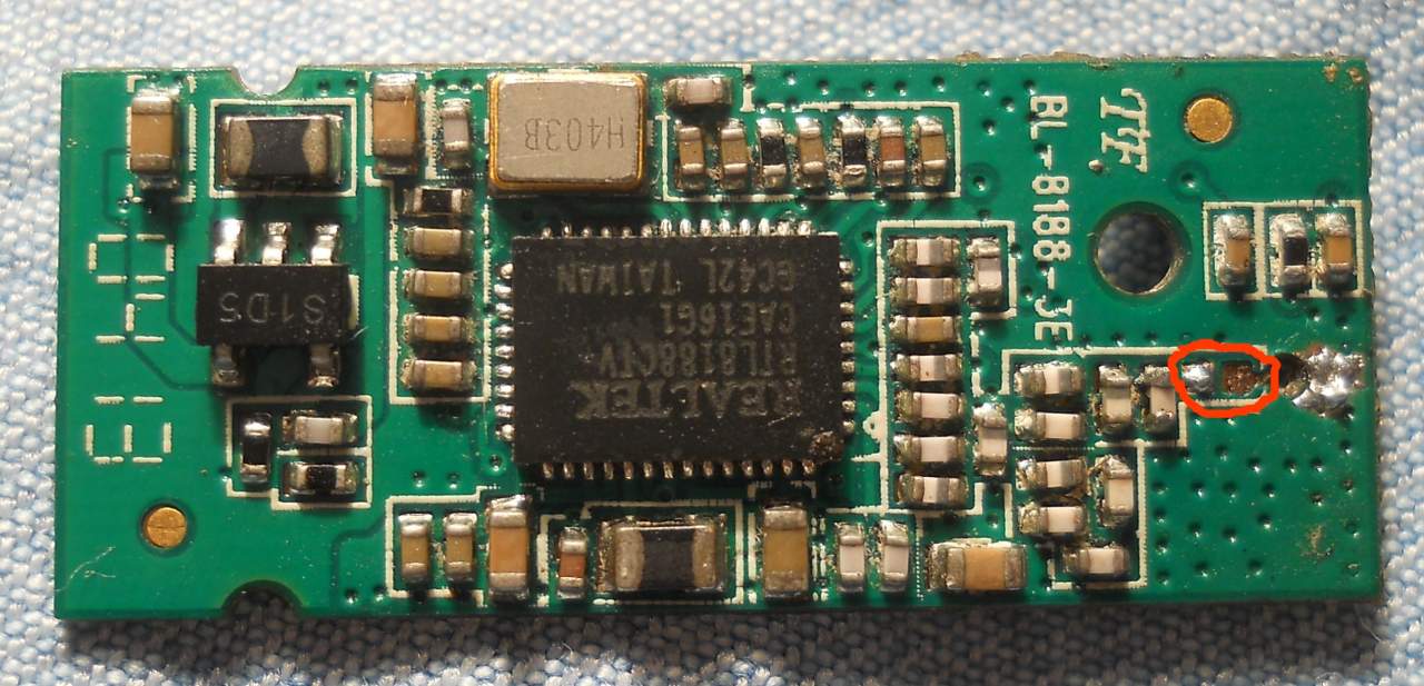Здравствуйте! Мне один мой товарищь (кулибин) отдал Мини USB Wi-Fi адаптер модель LF-02W со встроеной маленькой антенкой, он в этом адаптере хотел впаять в место той антенки, кабелек для выносной антены. В итоге 100 ватный паяльник + кривые руки сделали свое дело. Пятачек на платке куда должна припаиваться центральная жила кабеля отлетел, после чего ему посоветовали припаяться к смд конденсатору, который как он рассказывал прилип к паяльнику и после долгих мучений вернуть его на место, кудато улетел.