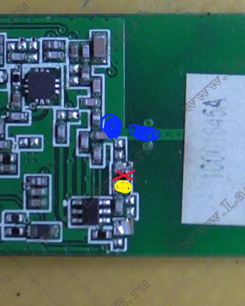На фото отметил недостающий конденсатор. и там нету одного пятачка на платке там где припаивался конденсатор. И негорит светодиод, а так работает только неловит без антенки. Что можно сделать подскажите?