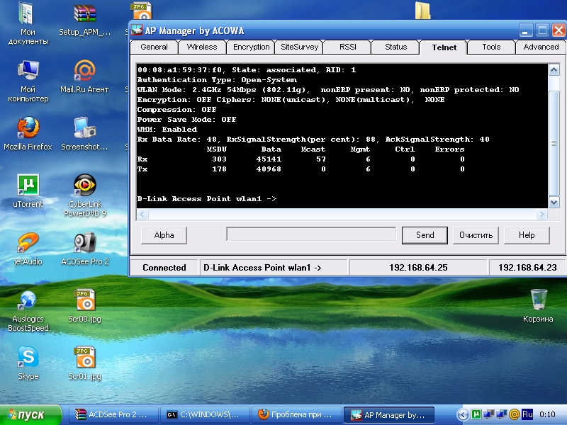 Здравствуйте, у меня линк 300 метров оборудование две точки доступа D-Link dwl2100ap и две направленные антенны D-Link Ant24-1201(разчёска) удаленная точка пятиэтажка крыша термобокс, локальная точка мой частный дом крыша! Видемость обсолютно премая! Удалённая точка настроенна в режиме Access Point а локальная в режиме Wireless Client. Скорость должна быть 8-10 мегабит. Всё работалло более менее нормально месеца два, если так можно сказать! И вот как неделю назад и до сих пор скорость колеблиться от 1 до 3 мегабит, в чём дело не знаю! Ping удалённой точки шас от 50 до 600mc уровень сигнала 70-90. Перезагружал не помогло перпрошил два дня назад прошивка 2,50, вроде пинг стал ровным от 2 до 7 mc а скорость интернета не выросла. A сегодня опять пинг от 100 до 600мс и скорость интернета 1,5 мегабит пробывал менять каналы не помогло перезагружать не помогло. Звонил провайдеру они уверяют что у них всё отлично только они видят мою удалённую точку а мою которая стоит у меня дома не могут зайти,Помогите что делать что исправлять до этого было всё нормально а щас скорость в разы упала, Иззвените за ошибки