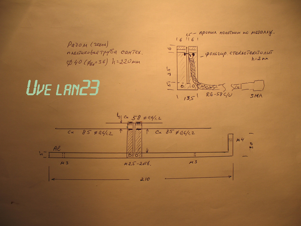 Размеры есть во вложенном файле ММАНА.Дублирую чертежом "с коленки".Кабель RG-58CU на участке 50мм оголить от изоляции ,на этот участок наложить бандаж проводом д=0.2/0.3 мм.После припайки(по чертежу) в нижней части опоры(как на фото) несколькими витками голого провода прижать кабель к своей половинке опоры.Радом прикручен двумя винтами М3 к рефлектору.Сверху радом у меня закрыт эбонитовым клотиком(или придумайте пластиковую крышку).Входное сопротивление антенны 50 Ом.Угол раскрыва ДН по углу места ок.36гр. По азимуту 160гр.По углу 180 гр усиление ок 2дБ(4дБи).По усилению эта антенна полный аналог зига(билупа).Но усиление за счёт сжатия ДН по углу места(у зига в основном сжатие по азимуту).Этим она выгодно отличается от зига у которого сектор излучения почти в два раза уже.