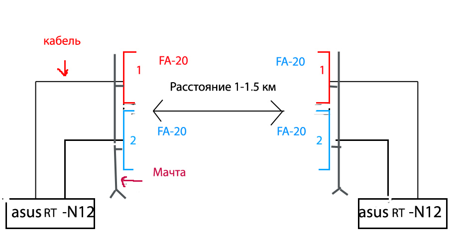 1 если взять маршрутизатор d-link dir 615 или asus RT-n12 , корыте имеют по 2 гнезда под Антенны, то пойдут ли антенны Fa-20 , если например берем два asus RT-n12 к одному подключаем две Fa-20 и к другому.. Fa-20 крепим на одну стойку(мачту). расстояние между маршрутизаторами примерно 1.-1.5 км