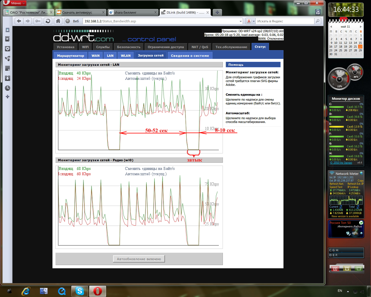 Dlink-DIR300 rev b, с прошивкой DD-WRT v24-sp2 (08/07/10) std - build 14896, работает в режиме Репитер-мост около года. Берет интернет по Wifi от Dlink 2640bru и раздает его клиентам по Lan и Wlan. С некоторых пор стал тормозить каждые 50сек. Сброс в заводские установки, а также сброс 30/30/30 не дал результатов. Что можно предпринять чтобы устранить проблему? Или пора его в топку?