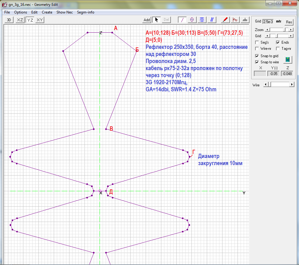 Программа 4NEC2 посчитала их верно и после переноса редактировать не пришлось! Я занимался только наклоном неромбиковой части вокруг оси проходящей через точку В. Такой метод настройки я подсмотрел у себя на практике, его требовалось только подтвердить расчётом. Прийти к этому через расчёты было бы значительно сложнее. Модель удовлетворительно считается по времени только после четвертования (провода тонкие-2мм в диаметре). И, кстати, я позабыл поставить борта до четвертования, так что думаю, усиление в реале больше.