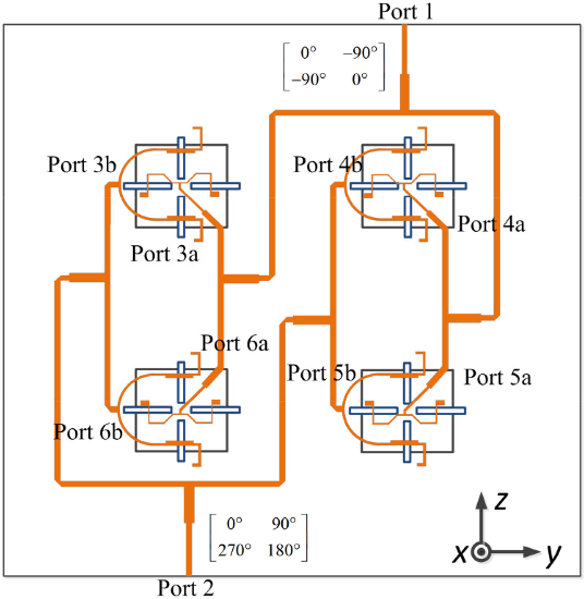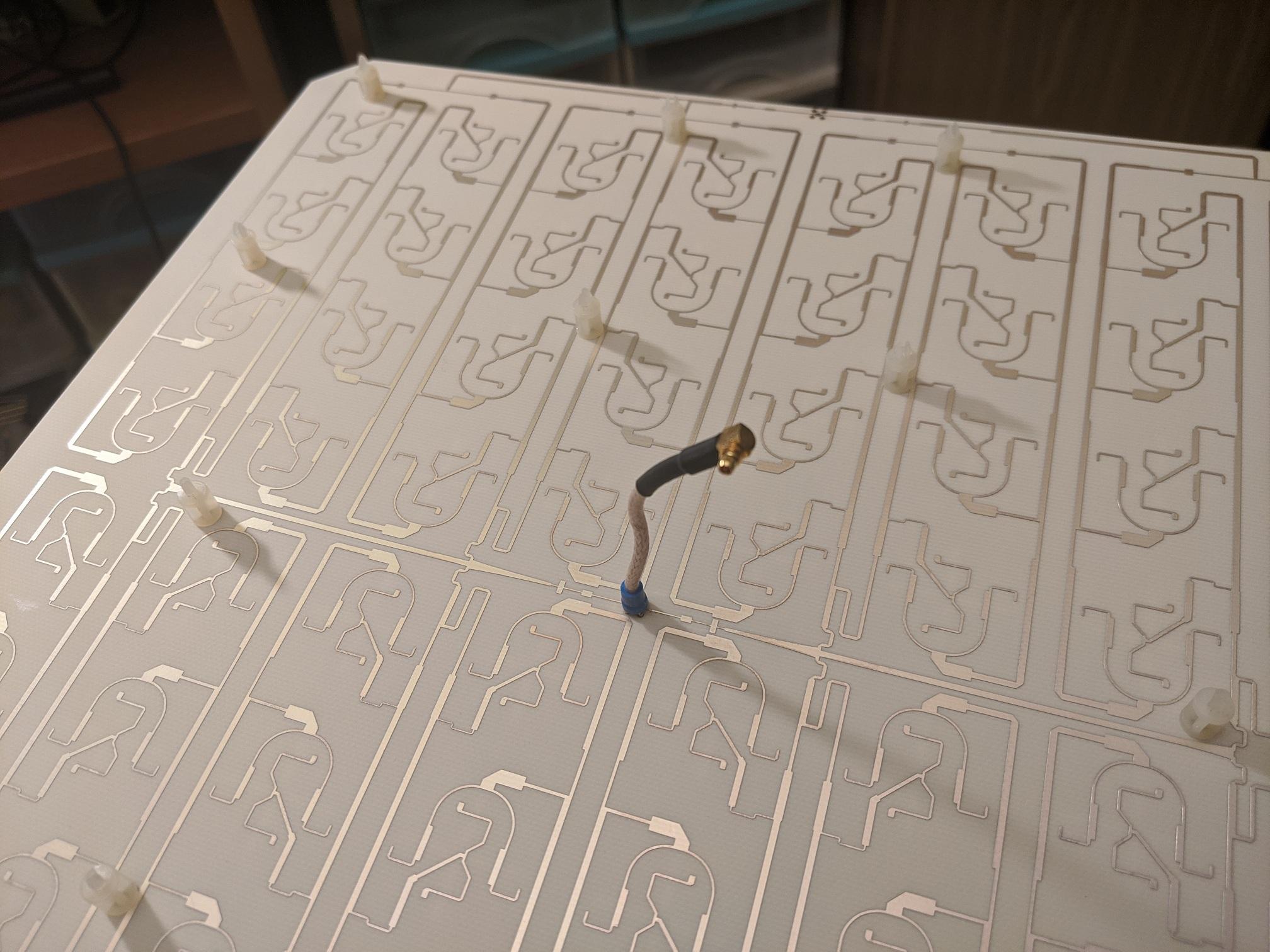 Для получения MIMO 2x2, каждый патч возбуждается парой зондов, они сходятся собирающими линиями на 2 порта антенны, один в центре, другой у ребра
