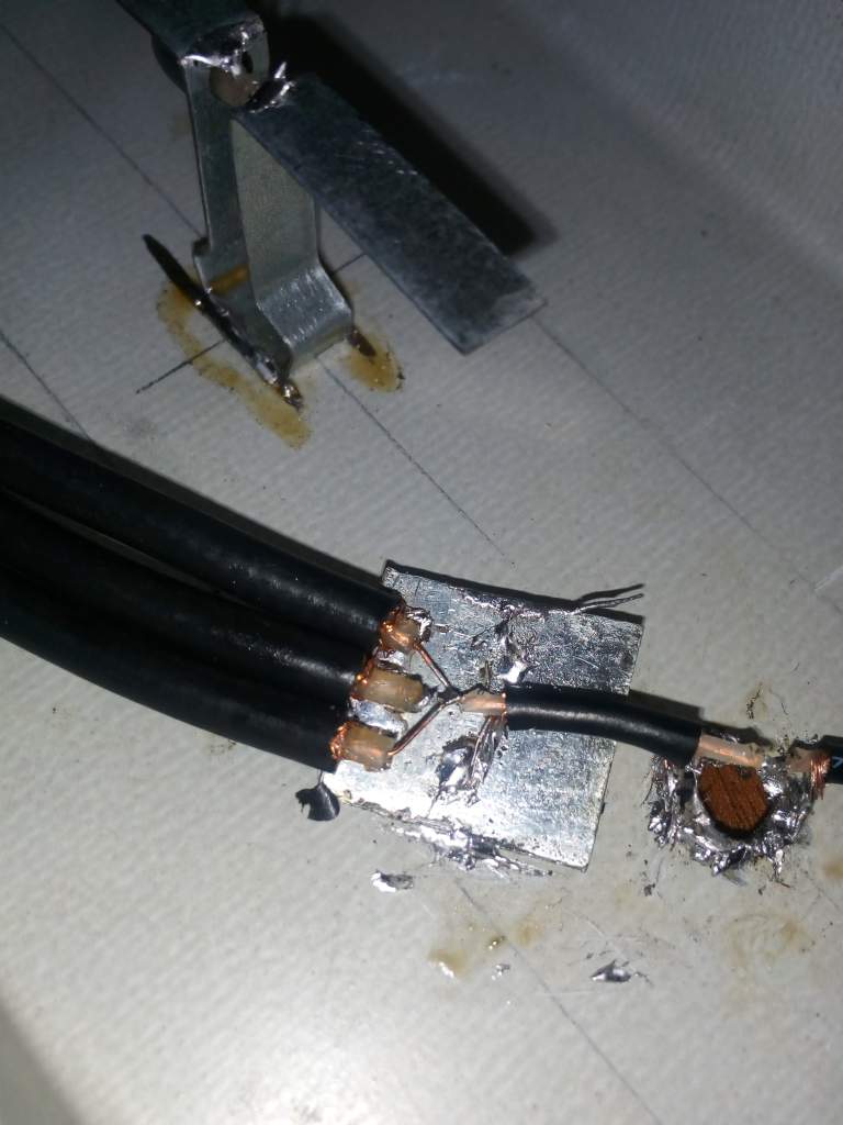 Строго не судите, т.к. разъемы для антенн две недели едут с ebay - еще не приехали - провод был пропущен через трубочку латунную и запаян напрямую, ну и первоначальный вариант антенны уже модернизировался (менял 2 провода к диполям и менял участки трансформаторов с РК50-2-ХХ 21мм на RG174 26мм.