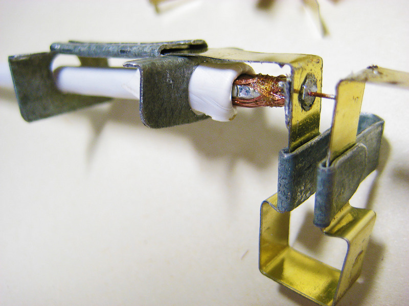 Писали, что с кабель с [пено]полиэтиленом трудно паять, поэтому сделал две прихватки из кусочка оцинковки:
