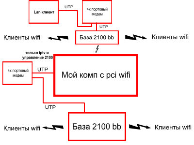 Хочу сделать такую схему: поставить у себя модем (кинуть провод от сплиттера соседей (у них нет инета) к себе ) И сделать себе iptv. Но в то же время хочу поставить на это модем еще и базу (2100) чтобы еще клиентов цеплять.