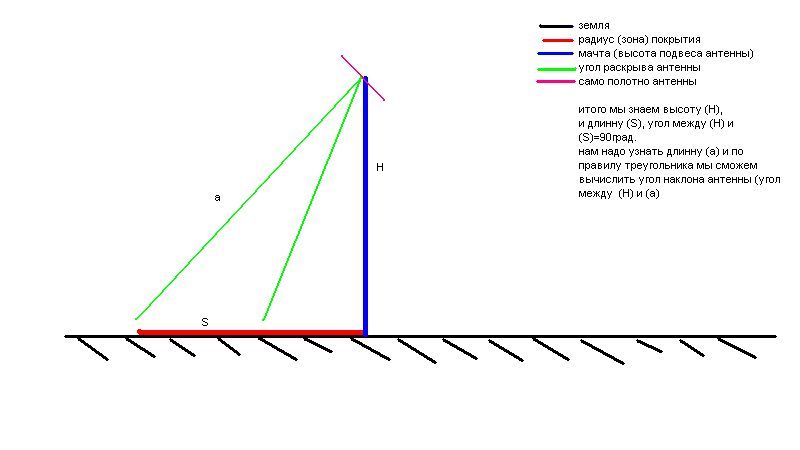 потом зная высоту подвеса и желаемый радиус покрытия мы сможем по принципу ращёта треугольника выщитать угол верхней вершины, вот он и должен быть углом наклона для антенны (луч основного излучения должен совпадать с боковым лучом треугольника)