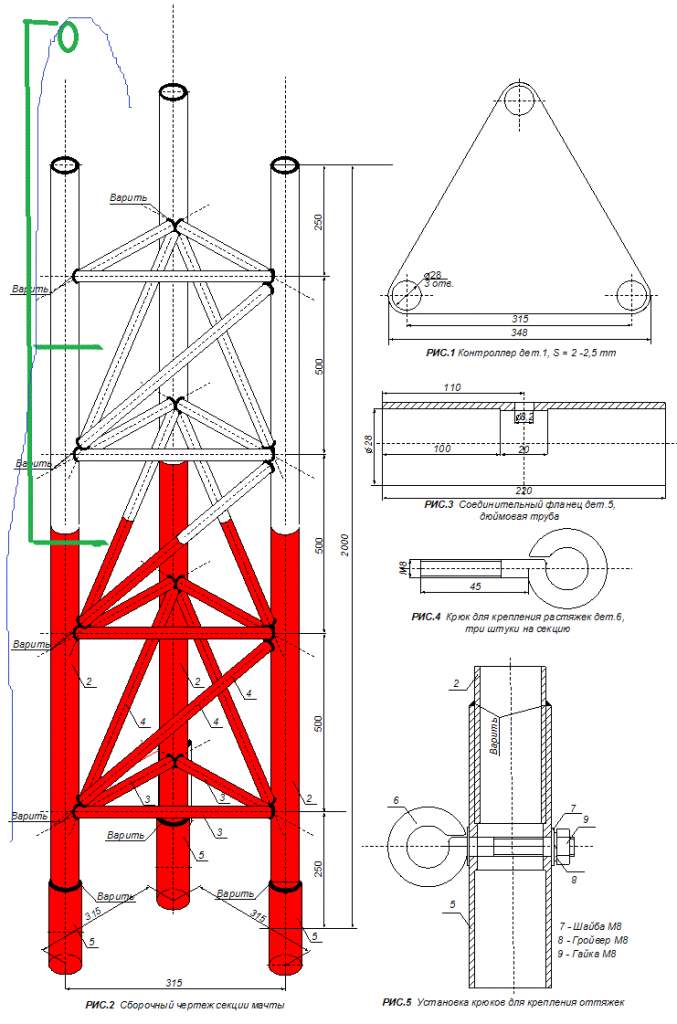 Как сделал я.. 3 квадратных трубы(50-ка) по 2,50 м. сварил между собой,потом обварил сверху 50-тым уголком длиной 30 см с двух сторон,итого 7,5 м. В них вставил 2 (40-ки) по 4 метра каждая, также уваренных 4-тым уголком 40 см. длинной, итого 8 м. Через каждые 35 см ступенька из 35 уголка длиной 35 см. Дальше 2,1 м. 30-ки, на стыке 30Х30 смотровая площадка из 20-ки уваренной в сороковку под углом и увязанной 12-той арматурой(смотровая без бортика), в землю на 50 см(ниже 40-ка началась глина, т.е упор-отличный) забетонировал 60-ку, растяжки значит, 1 ярус на высоте 7,5 метров трос-4-ка-3 шт. в оплетке пвх, предельная его нагрузка 7500 ньютонов, вот теперь считайте если берут 1 Н на кг. Второй ярус соответственно крепится на смотровую,точнее за то, что её держит на высоте 14,5 метров спаренными тросиками диаметром 3 мм каждый с 3-х сторон( одного оказалось маловато, да и страшновато лезть=). Также над смотровой (на высоте пояса) из широкополосной стали круг на него наварена круглая 30-ка под передатчики и антенны в два яруса, ну а пока что там ютятся два тп линка который наружные и всенаправленка на 15 дби, скоро пополнение боезапаса. ПРЕДУПРЕЖДЕНИЕ! Данная мачта ставилась краном - стрела - 21м. Под растяжки были залиты столбы и материала ушло туды 3 тонны, в хламе - пополаме дальше решайте сами ;) Только не нужно попрекать идеями мол слабо, и неточно, до этого был опыт с монтажными высоковольными пирожками лэп в солидной организации, тама нагрузки куда более..