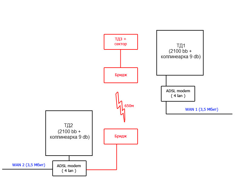 Имею вот такую сетку. Так как на wan 1 и так уже сидит куча народу, а канал маленький, появилась необходимость реализации репитера с ТД1 на wan 2. Так как подобного еще не делал, прошу помощи как лучше и проще это сделать... Я понимаю, что рядом с ТД2 придется ставить репитер с направленной антенной в сторону ТД1, а вот как лучше сделать на стороне ТД 1 ? Поставить 2 точки (одну со всенаправленной антенной, другую в режиме репитера с антенной в сторону ТД 2 ? Или еще варианты есть ? Может как то часть клиентов с ТД1, с помощью репитера перекидывать на ТД2 ??? Между ТД1 и ТД2 есть прямая видимость, зона Френеля свободна, эфир более ни менее чист...
