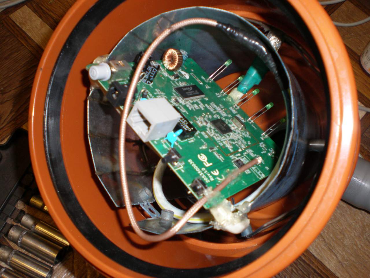 привет, продолжение темы , про биквады, смастерил вот такую фигню))), внутри точка тп линк 701, а то надоели потери сигнала, в вч кабеле. запитал через пое, работает хорошо, слишком далеко не замерял, но с телефоном метров за триста , четыреста работает. трубки , торчащие, это типа вентиляция, не знаю надо не надо, время покажет, что скажете, гуру?