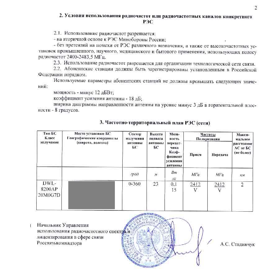 Вот и объяснение : "Забыл,я из Ставропольского края".Сообщение от sasa Посмотреть сообщениеПривет! У меня сельская сеть,четыри точки доступа ДВЛ-2100АП с антеннами бестер сектор,в сентябре 2008 года мне без всяких разрешений на использование частоты в краевом ГкРЧ