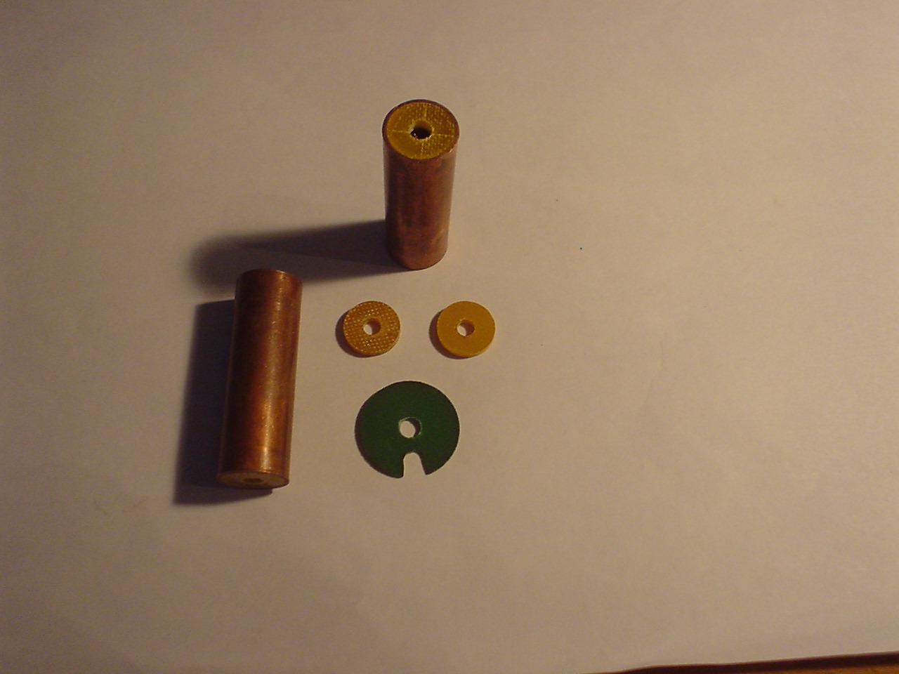 изготавливается, из трубок которые используются для ремонтов кондиционеров, для того чтоб их точно нарезать используется труборез, после нарезки нужно снять внутренние заусенцы и слегка развальцевать, например обратной стороной напильника, далее берём стеклотекстолит без фольги, режим квадратики несколько больше диаметра трубы, с отверстием в центре, длинным болтом соответствующего диаметра их сжимаем, вставляем в дрель и напильником обтачиваем до диаметра чуть,чуть больше внутрений диаметр толстой трубки (это у ково токарного нет) далее устанавливаем на шайбу трубку, и лёгким ударом её запресовываем, также и с другого конца, таким же образом изготавливаем шайбы разделительные диаметр их 18мм, и с внешней стороны по диаметру делаем высечку, чтоб туда входила тонкая трубка, почему 18мм, у меня просто полистироловая труба и туда эта конструкция с натягом вставляется, далее вся эта конструкция связывается проволокой, и пропаивается пропановой горелкой, единственный элемент где прийдётся ручками поработать это подстроечник в трубке