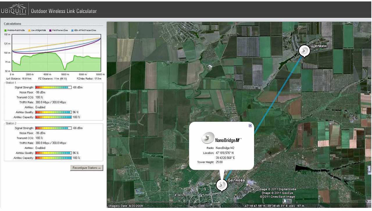 При высоте 25-30метров 9ти этажки, мачту в посёлке надо поднимать на 55 метров. На одной картинке скорость без шума в эфире при идеальном линке 300мБит, а на второй с шумом 10дБ - 180мБит. Скорости высокие, но прога катигорически не позволяет опускать антенну ниже 55 метров, ругается, что уже нельзя. А из практики при офсетных антеннах на сколько от идеала может упасть скорость?