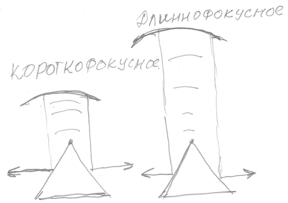 Зеркало короткофокусное f/d 0,4-0,5 , облучатель в вершине конуса.